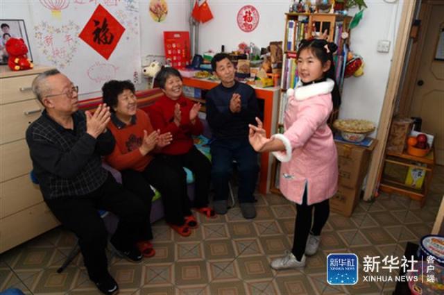 ↑李冰的女儿吴景涵(中)在给爷爷、奶奶展示期末考试成绩(2月4日摄)。