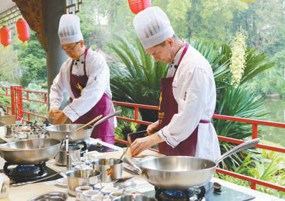 外国游客在川菜博物馆体验烹饪麻婆豆腐。