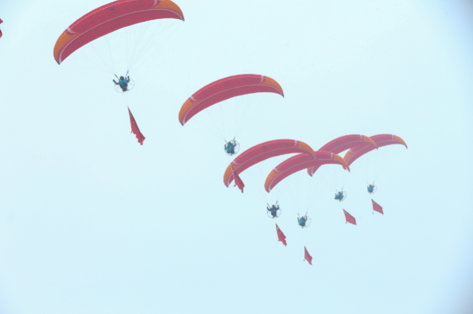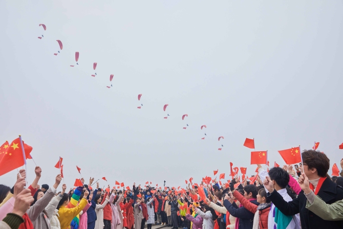 在歌曲高潮部分,十架动力伞从远空滑翔而来,挂上鲜艳的五星红旗。同时,一艘载客近千人的大游轮开足马力,驶向洲头。此时,船上、岸上、天上——“海陆空”三处遥相呼应,引爆全场激情,万人挥舞国旗,高声同唱《我和我的祖国》,给祖国送上新春祝福。