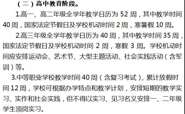 按照通知,高一、高二年级全学年教学日历为52周,其中教学实践为40周,寒暑假10周;高三年级全学年教学日历为40周,其中教学时间35周,寒假3周。