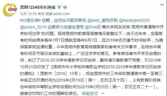 针对网友提出的“学校是否存在提前开学”的疑问,2月13日上午,昆明市教育局、昆明12345市长热线也分别在官方微博上发布了回应:
