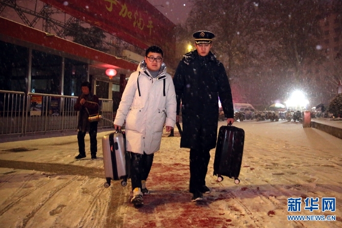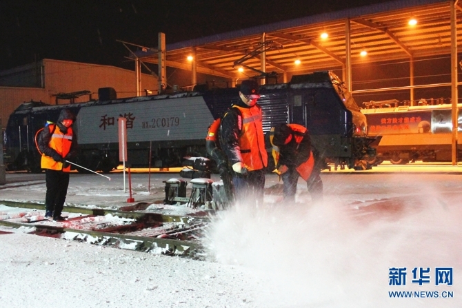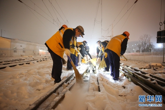 2月13日,河南普降大雪,中国铁路郑州局集团有限公司职工以雪为令,迅速行动,连夜组织在岗和休班职工进行清扫车站站台、股道道岔积雪,确保春运期间交通大动脉安全畅通,让旅客走得了、走得好。