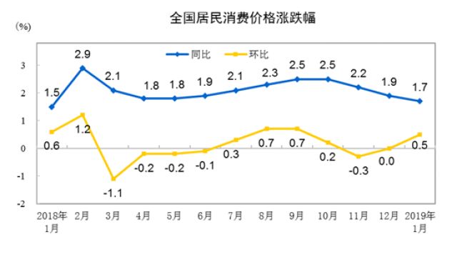 2019年1月份,全国居民消费价格同比上涨1.7%。其中,城市上涨1.8%,农村上涨1.7%;食品价格上涨1.9%,非食品价格上涨1.7%;消费品价格上涨1.3%,服务价格上涨2.4%。