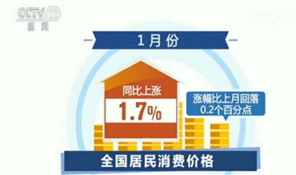 1月份,全国居民消费价格同比上涨1.7%,涨幅比上月回落0.2个百分点,1.7%的同比增速也是近一年来新低。其中,食品价格上涨1.9%,涨幅比上月回落0.6个百分点;非食品价格上涨1.7%,涨幅与上月相同。