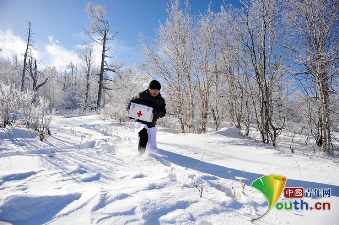 伊尔施镇东约80公里的太平岭有一座通信基站,职工通常工作10天才下山休息,侯立峰背着药箱探访上班的职工。中国红十字基金会 牛宏超摄