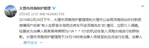 针对有网友反映“有人在罗荃半岛附近将车开进洱海洗车”的情况,澎湃新闻从大理市洱海保护管理局官方微博获悉,经查实为当事人杨某某将机动车驶入洱海水域进行拍照合影,已对其处以2000元的罚款。(2月25日 澎湃新闻网)