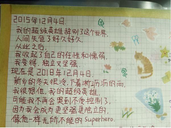 孙莹说,其实在2014年11月,她的父亲刚刚确诊肺癌,治疗也花了二三十万元,“我那么努力,就想证明给爸爸看,但我的病把他吓住了,本来他的肺癌也控制得不错,后来脑转移,他把钱留给我,自己放弃了治疗。”2015年12月,孙莹经历了父亲的去世,她在日记本写下“我的超级英雄辞别了这个世界,人间失色了好久好久,从此以后,我收起了自己的任性和懦弱,我变得独立又坚强”。