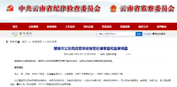 昆明信息港讯 据云南省纪委省监委网站,楚雄州纪委监委消息,楚雄市公安局政委裴宏涉嫌严重违纪违法,目前正在接受纪律审查和监察调查。