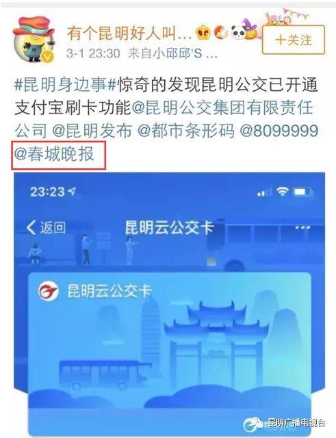 “3月1日,有网友发微博称:“惊奇的发现昆明公交已开通支付宝刷卡功能。””