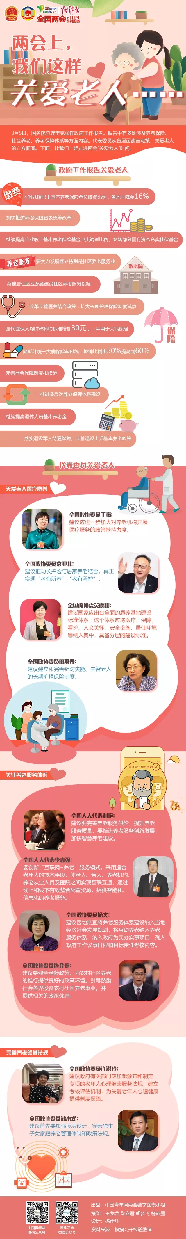 3月5日,国务院总理李克强作政府工作报告。报告中有多处涉及养老保险、社区养老、养老保障体系等方面内容。代表委员从各层面建言献策,关爱老人的方方面面。下面,让我们一起走进两会“关爱老人”时间。