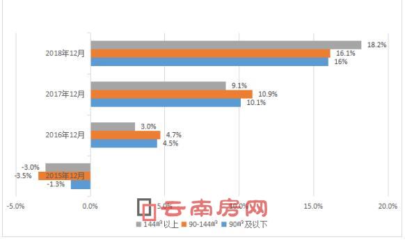 2018年涨势有了变化,144平方米以上户型房价涨幅超过了其他两个面积段的涨幅,成为涨幅最高的一个面积段,达到了18.2%。也就是说,2018年,144平方米以上的户型均价最高。