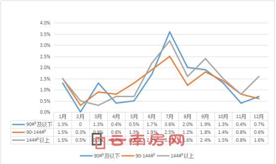 可以看出,2016年和2017年,90-144平方米阶段户型房价涨幅最高,144平方米以上户型涨幅最小。