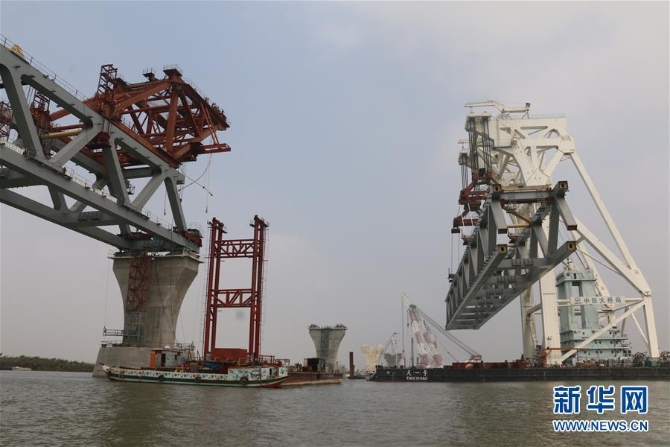 2月20日,在孟加拉国帕德玛大桥项目工地,中国建造的万吨级中心架梁起重船“天一号”准备将总重超过3000吨的钢梁架设到桥墩上。新华社发 段永红/摄