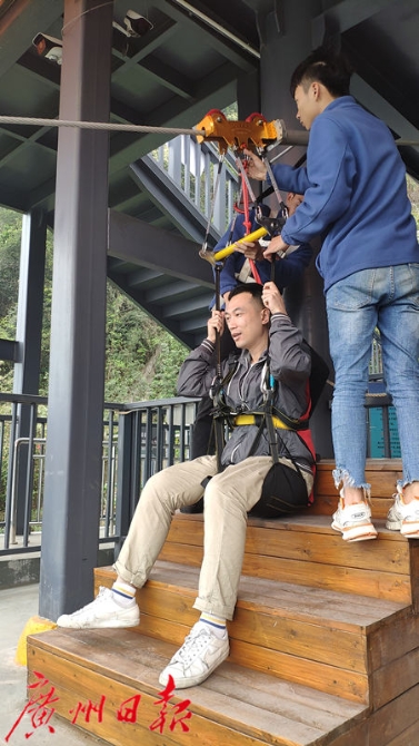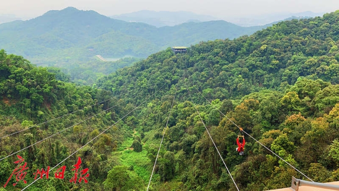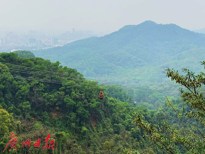但滑索滑行相当平稳,记者也逐渐适应,记者只需举起双手抓好头顶的扶杆,就能安心的欣赏脚下和远处的风景。白云山葱葱绿树、高低起伏的山峦美景,可谓尽收眼底。