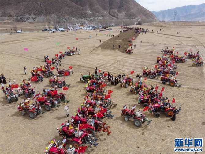 3月16日在拉萨市达孜区唐嘎乡拍摄的开耕仪式现场(无人机拍摄)。新华社发(孙非 摄)
