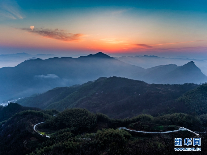 3月23日,霍山县磨子潭镇龙井冲村,晨曦中的盘山公路。新华网发 (徐程 摄)