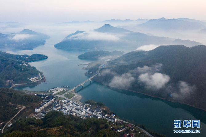 3月23日,清晨的霍山县磨子潭镇龙井冲村,远山如黛白云飘荡,宛如一幅山水画卷。新华网发 (徐程 摄)