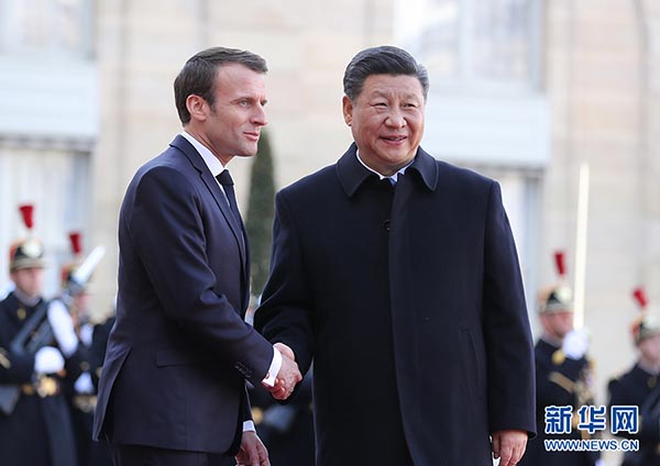 3月25日,国家主席习近平在巴黎爱丽舍宫同法国总统马克龙会谈。会谈前,马克龙在凯旋门为习近平举行隆重、盛大的欢迎仪式。 新华社记者 姚大伟 摄