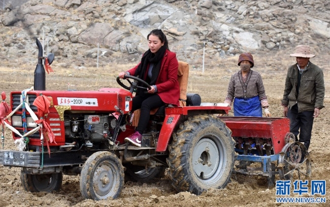 德吉央宗在农忙时节帮助农民开拖拉机播种(2015年4月24日摄)。新华社记者 觉果 摄
