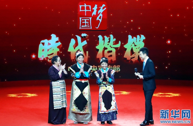 被授予“时代楷模”称号的卓嘎(右二)、央宗(左二)姐妹在“时代楷模”授予仪式上与主持人和观众互动交流(2018年10月16日摄)。新华社记者 潘旭 摄