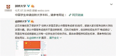 2018年10月,伯明翰大学官网宣布“自2019年起,中国学生可以直接用高考成绩申请伯明翰大学本科课程。”这条消息当时引起了极大关注,因为伯明翰大学是英国精英大学联盟“罗素集团”成员中第一所正式对外官宣认可中国高考成绩的大学。随后不少院校也对外发布了接受中国高考生的录取标准。最近,媒体又纷纷报道,备受瞩目的剑桥大学也宣布接受中国高考成绩,想必这个消息一定会让不少今年的高考生和家长兴奋不已,不过,不要高兴得太早,因为除了高考成绩的要求外,申请者还需满足其他一系列要求,包括语言和学术方面。但在3月25日,剑桥大学通过官方微博发布消息称,承认中国高考成绩并不是剑桥新闻,已执行数年,但剑桥的招生并不“唯成绩论”,而是在考试成绩基础上对每一位学生进行综合评估。具体申请程序和招生标准可参考学校招生网站。文、图:广州日报全媒体记者 李琼