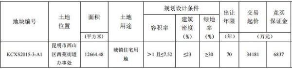 昆明市国土局信息显示,西山区西苑街道本次出让地块编号为KCXS2015-3-A1,交易面积12664.48平米(约合19亩),土地性质为城镇住宅用地。地块容积率>1且≤7.52,最大可建面积约9.52万方,交易起价约34181万元,土地单价约1799万元/亩,楼面价约3589元/平米。