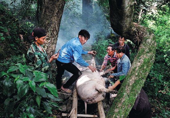 村民到大榕树脚分发龙肉(祭祀后的猪肉叫龙肉)