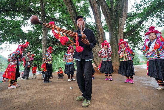 省级葫芦笙舞传承人带领村民跳彝族葫芦笙舞