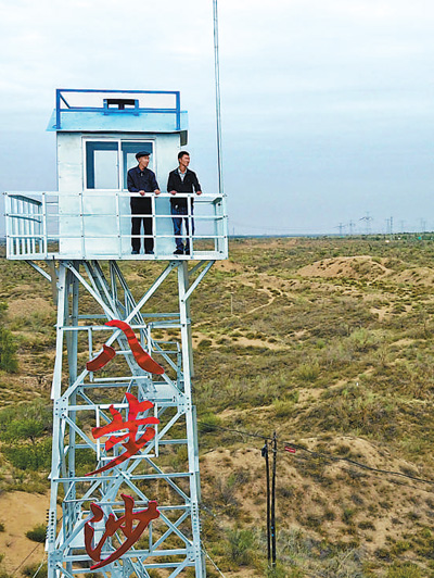 第二代治沙人郭万刚(左)和第三代治沙人郭玺在林场瞭望塔查看防沙治沙情况。新华社记者 范培珅摄