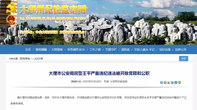 大理市公安局经侦大队民警、开发区派出所原所长王平严重违纪违法被开除党籍和公职