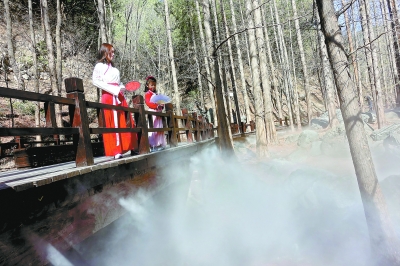 北京植物园樱桃沟内喷雾开启,游客漫步在栈道之上,穿行于水杉林间,脚下薄雾泛起,仿佛步入人间仙境。记者吴镝/摄