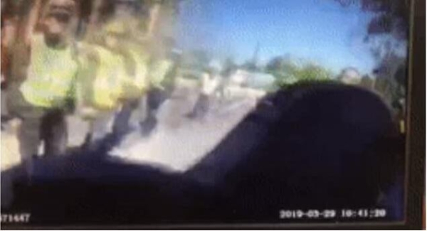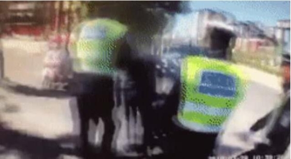 民警开始对其进行口头警告,但驾驶人依然情绪激动。电动自行车后排乘坐的乘客开始拿着手中的铝合金边框和一把锯子向民警挥舞。