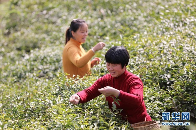 3月28日,骆家坝镇大兴村的两名妇女在茶园采摘春茶。随着气温回升,地处秦巴山区腹地的陕西汉中市西乡县骆家坝镇的茶农忙着采摘春茶。 新华社记者都红刚摄