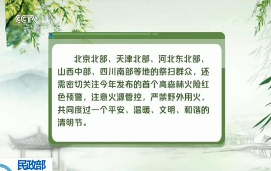 北京北部、天津北部、河北东北部、山西中部、四川南部等地的祭扫群众,还需密切关注今年发布的首个高森林火险红色预警(2-8日),注意火源管控,严禁野外用火,共同度过一个平安、温暖、文明、和谐的清明节。