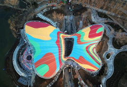 春风和煦,草长莺飞,海坨山下,妫水河畔,94把巨型“花伞”在湛蓝天空的映衬下竞相绽放。这是2019北京世园会主场馆之一的国际馆,现在工程已经基本完成。由钢柱和悬挑钢梁构成的94把“花伞”形成花海,是其令人惊艳的特有造型。