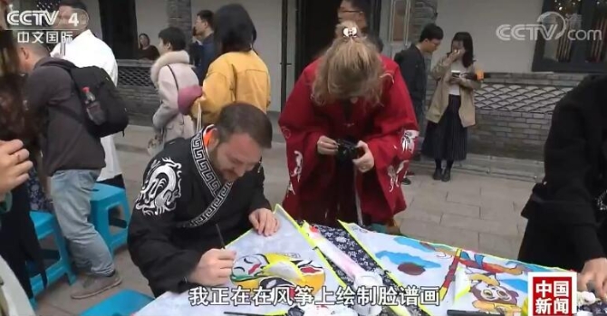 外国游客:我正在在风筝上绘制脸谱画,今天我们还观赏了槜李花,非常美丽,很有意思,接下来还要去放飞自己制作的风筝。