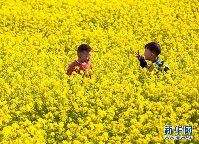 4月7日,小朋友在武安市西石门村的油菜花田里游玩。 近日,河北省武安市西石门村的油菜花竞相开放,绵延的花海一片金黄,吸引游人前来观赏。 新华社 记者王晓/摄