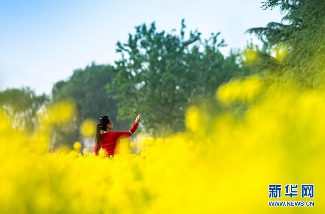 4月7日,游客在武安市西石门村的油菜花田里自拍留念。 近日,河北省武安市西石门村的油菜花竞相开放,绵延的花海一片金黄,吸引游人前来观赏。 新华社 记者王晓/摄