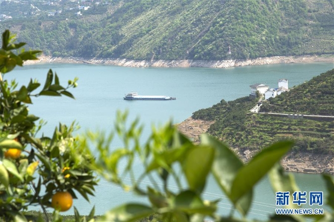 4月8日,船舶从秭归县泄滩乡牛口村橙园旁水域驶过。新华社发(王罡 摄)
