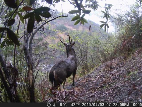 通过对红外相机捕获的照片分析,科研人员确认这头神秘的“鹿”并不是村民所称的马鹿,而是一头雄性水鹿,为国家二级保护动物。据介绍,这也是怒江地区首次拍摄到野生水鹿影像。