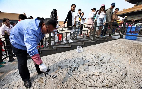 工作人员在北京故宫阶陛之间的云龙石雕上,清理不听劝阻的游客扔在上面的硬币