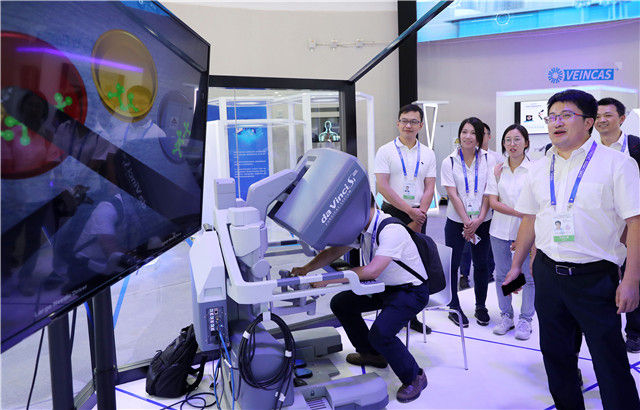 2018年9月17日,在上海举办的世界智能大会上,参观者在屏幕上观看一款机器人手术系统的作业演示。新华社记者 方喆 摄