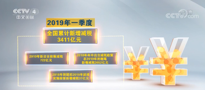 数据显示,一季度全国累计新增减税3411亿元。其中,2019年新出台政策减税722亿元,2018年年中出台减税政策在2019年的翘尾新增减税2652亿元,2018年到期后2019年延续实施政策新增减税37亿元。