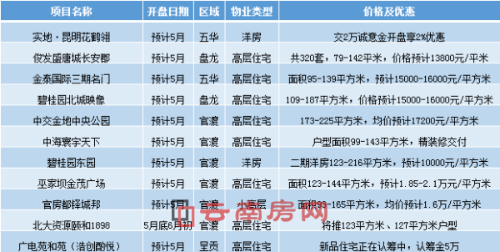 5月份有开盘计划的项目包括了巫家坝片区的中交金地中央公园、中海寰宇天下、金茂广场;西北片区的实地·昆明花鹤翎、金泰国际三期名门;北市区的俊发盛唐城长安郡、碧桂园北城映象;滇池半岛区域的官房都铎城邦、北大资源颐和1898;以及经开区的碧桂园东园和呈贡的广电苑·和园(浩创酌悦)。