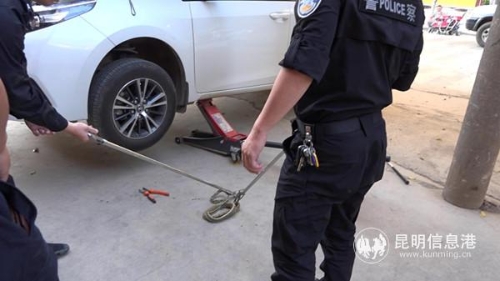 民警对车辆进行检查时,发现车辆发动机下方有异样,仔细一看,原来蛇紧紧缠绕在发动机下方,无法捕捉。民警将车开到附近的一家轮胎修理厂,借用店家千斤顶将车升高,把躲藏在车里的蛇捕获。