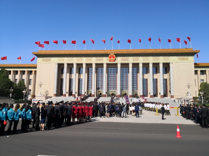 △上午8点半,与会者在人民大会堂东门外排队入场。(央视记者马立飞拍摄)