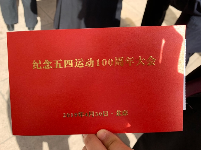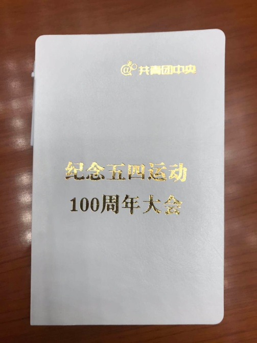 △每一位参会者面前都摆放着一本封面印有“纪念五四运动100周年大会”的笔记本。(央视记者钟锋拍摄)