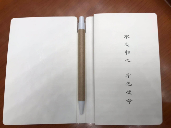 △与会者笔记本内页上写着“不忘初心、牢记使命”。(央视记者荆伟拍摄)