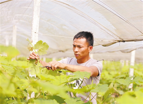 5月2日,江西省吉水县醪桥镇西坑村生态家庭农场,刘国富在葡萄园剪枝。刘国富从北京返乡创办了国富生态家庭农场,带领当地百姓脱贫致富。 廖 敏摄(中经视觉)
