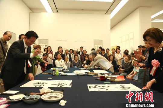“中日书法家挥毫交流会”4日在东京都美术馆举行,来自中日的多位书法家现场创作书法作品,内容跨越古今,吸引众多观赏者。